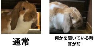 垂れ耳うさぎの場合は、よく見ると耳をいつもより前に出して、耳の内側を少し前にむけて耳を澄ましています。